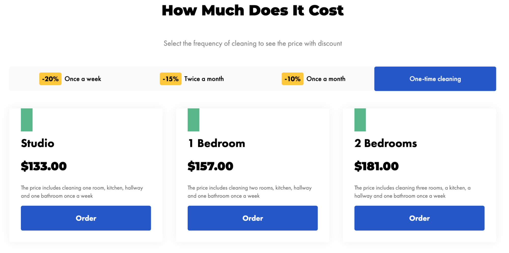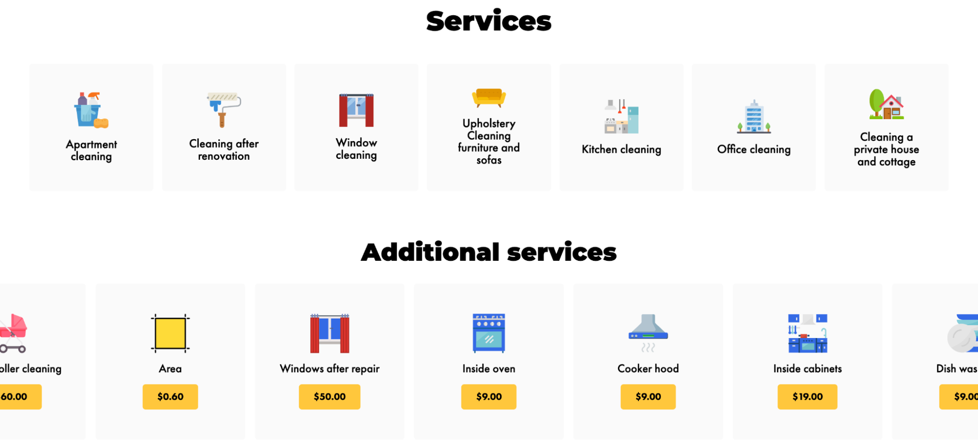 Start with a homepage that states your core offer: residential cleaning, commercial cleaning, deep cleaning. Add dedicated service pages for each offering so potential customers can find exactly what they need. List your service area by name (neighborhoods, cities, suburbs). Include your phone number prominently. And give people a pricing ballpark as "Starting from" pricing removes a major friction point.