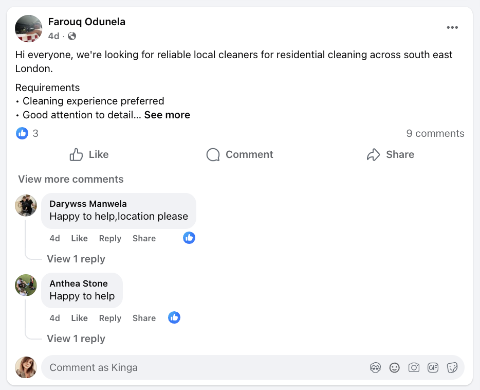When someone does post asking for a cleaner recommendation, your name will come up naturally: either because you've built familiarity, or because someone else in the group tags you. Neighborhood groups and local community platforms work because they mirror word of mouth at scale. You're not advertising but become present and useful, which is exactly how cleaning companies build trust in their target market.